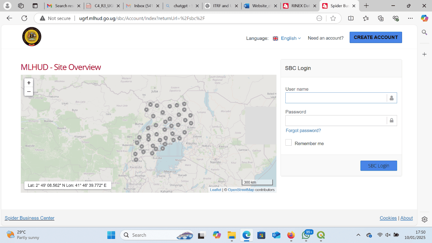 The Spider Business Center is an online platform (ugrf.mlhud.go.ug/SBC) for managing UGRF GNSS data and accessing advanced geospatial services. It allows users to connect to the UGRF network, manage their accounts, and access a variety of tools related to GNSS data collection, processing, and monitoring.