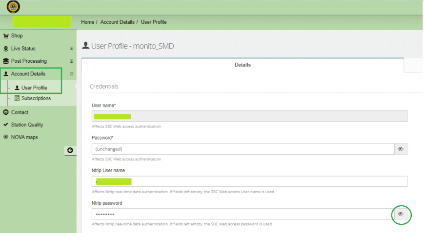 If you still manage to access your SBC interface but have lost your NTRIP credentials, you can find them on SBC in the “Account Details -> User Profile.”