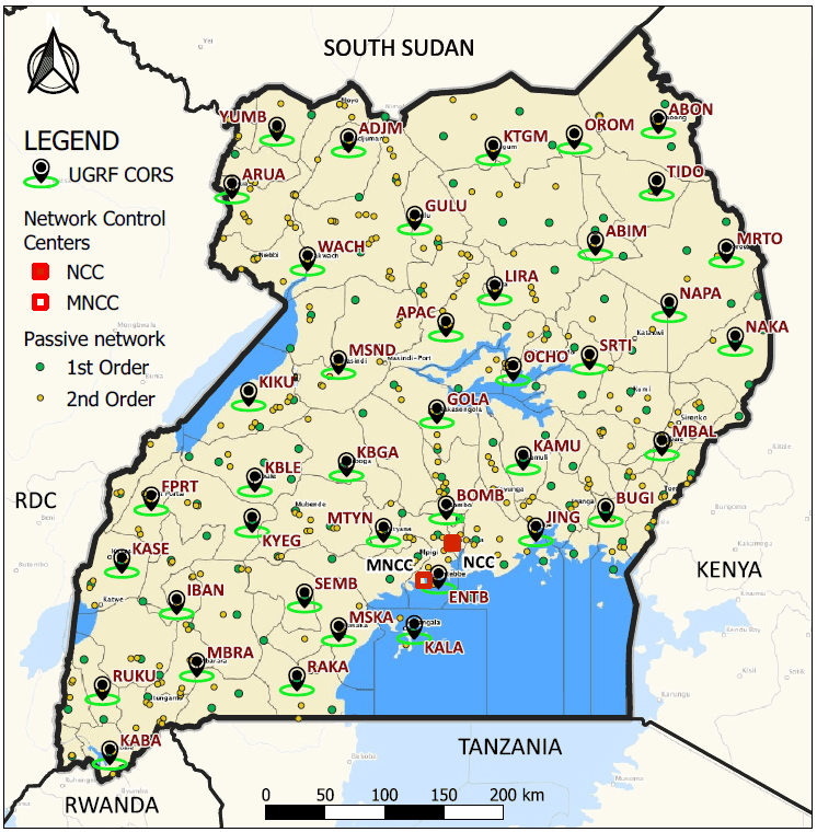 The Uganda Geodetic Reference Framework (UGRF) is a modern geodetic infrastructure providing accurate and reliable spatial data for geospatial activities in Uganda. It comprises a network of 40 Continuously Operating Reference Stations (CORS), 426 passive control points, and a transformation model for coordinates transformation.